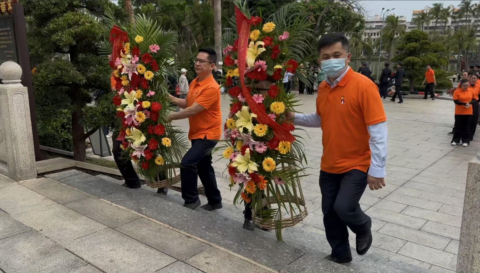 经过一段时间的等待才轮到乐动。乐动首先向烈士敬献花篮,花篮缎带上写着“为坚持琼崖革命23年红旗不倒牺牲的烈士们永垂不朽!”“为解放海南岛渡海牺牲的烈士们永垂不朽!”鲜艳的花篮寄托乐动对革命先辈的崇敬和哀思。